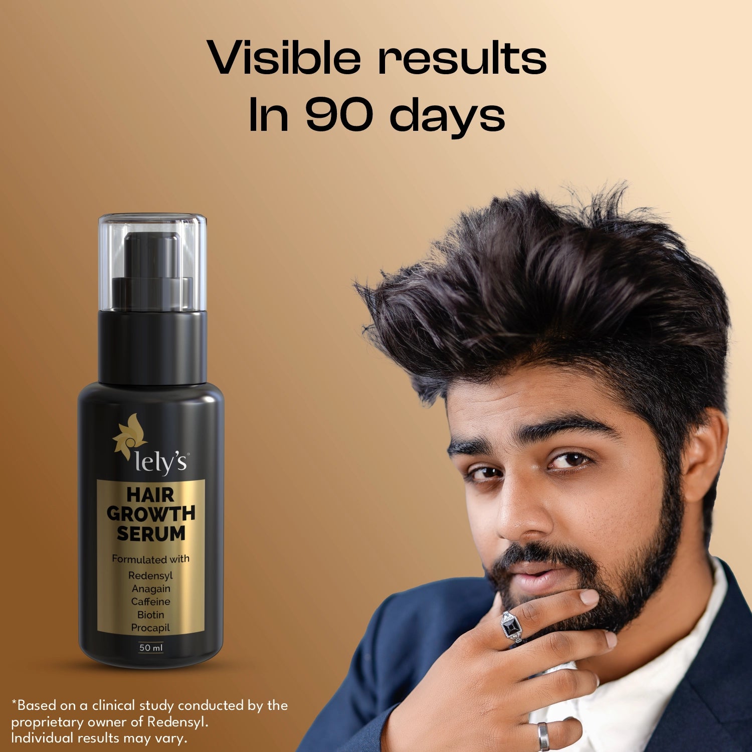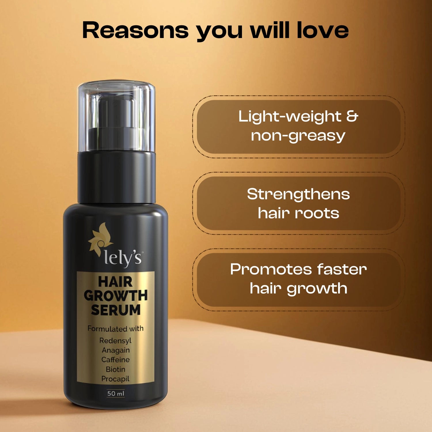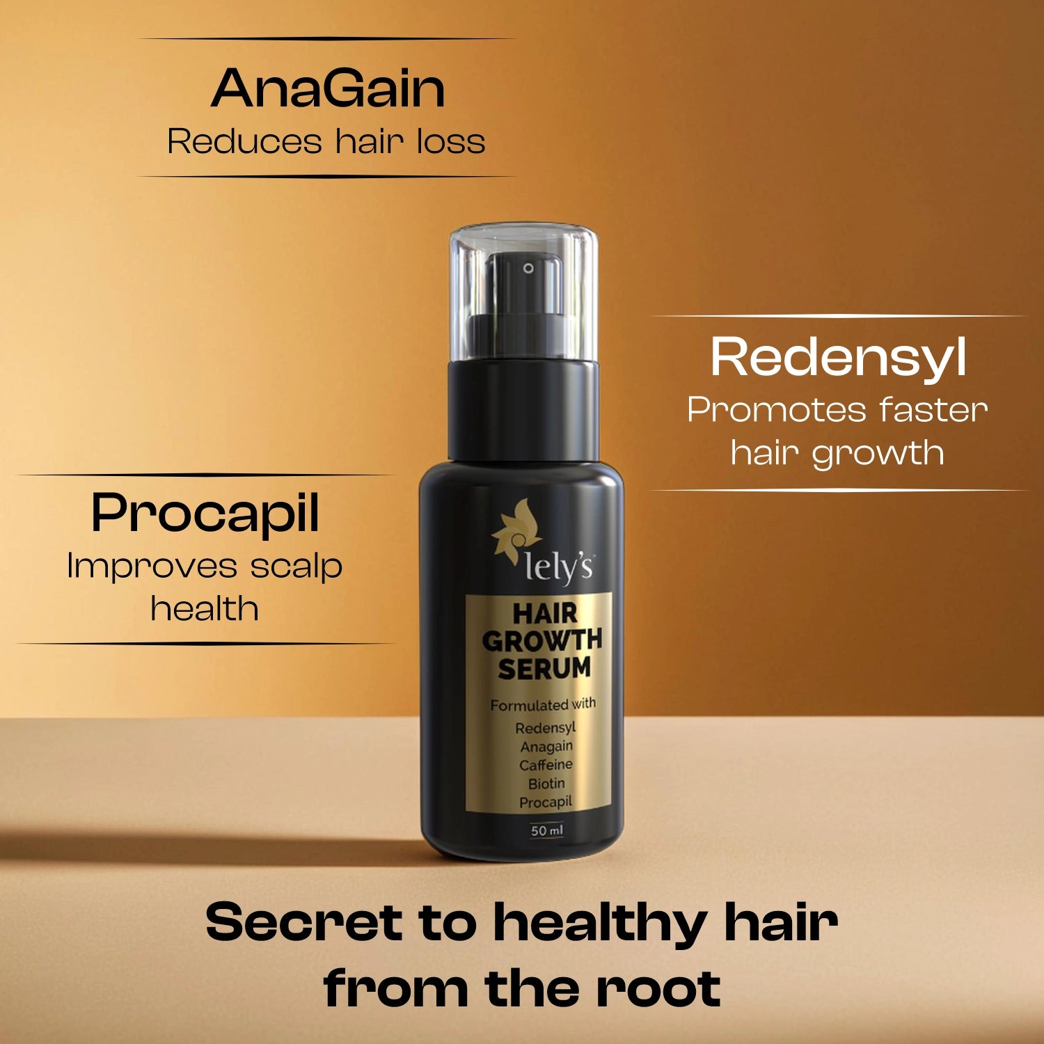 Lelys Hair Growth Serum is crafted with the finest ingredients like Procapil to target the root cause of hair loss, Redensyl to stimulate stem cells in hair follicles to boost hair growth, AnaGain to help hair follicles produce new hair, Caffeine to stimulate blood circulation, Biotin to reduce hair breakage and strengthen hair, and Saw palmetto to prevent hair loss.