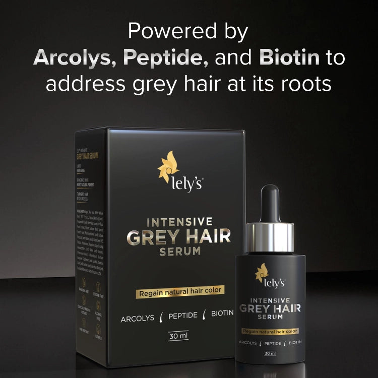 Lelys Intensive Grey Hair Serum is formulated with active ingredients like ARCOLYS®, WKPEP MELIT®, ANAGAIN™, and BIOTIN, which activate the melanin in hair follicles, prevent the growth of new grey hair, and improve hair structure and health. It targets the root cause of grey hair and increases its pigmentation levels.