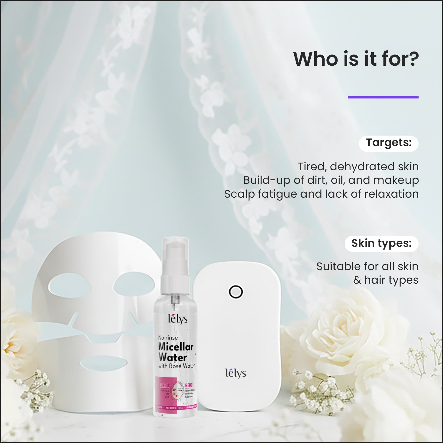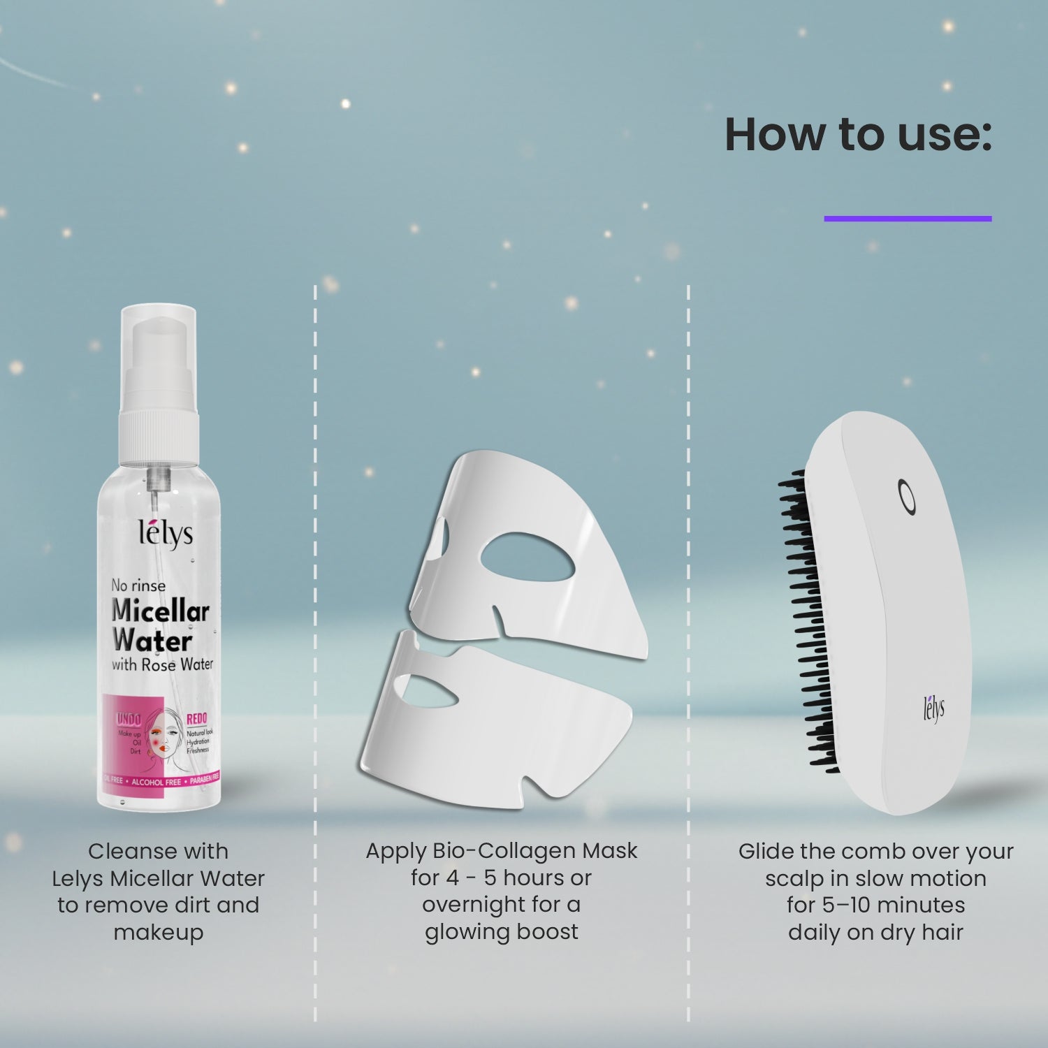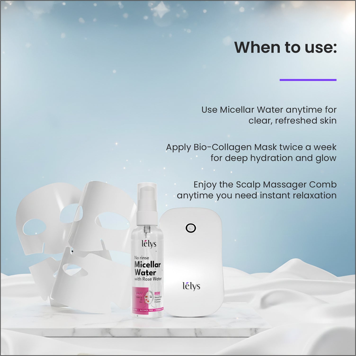 Lelys Celebration Kit for Guests supports skin and scalp wellness through scientifically backed ingredients and smart design. The Micellar Water cleanses without stripping moisture, the Bio-Collagen Sheet Mask replenishes skin with intense hydration, and the Electric Scalp Massager improves circulation to promote scalp health. Together, they revive dullness, reduce fatigue, and bring a visible glow and comfort in just a few minutes.