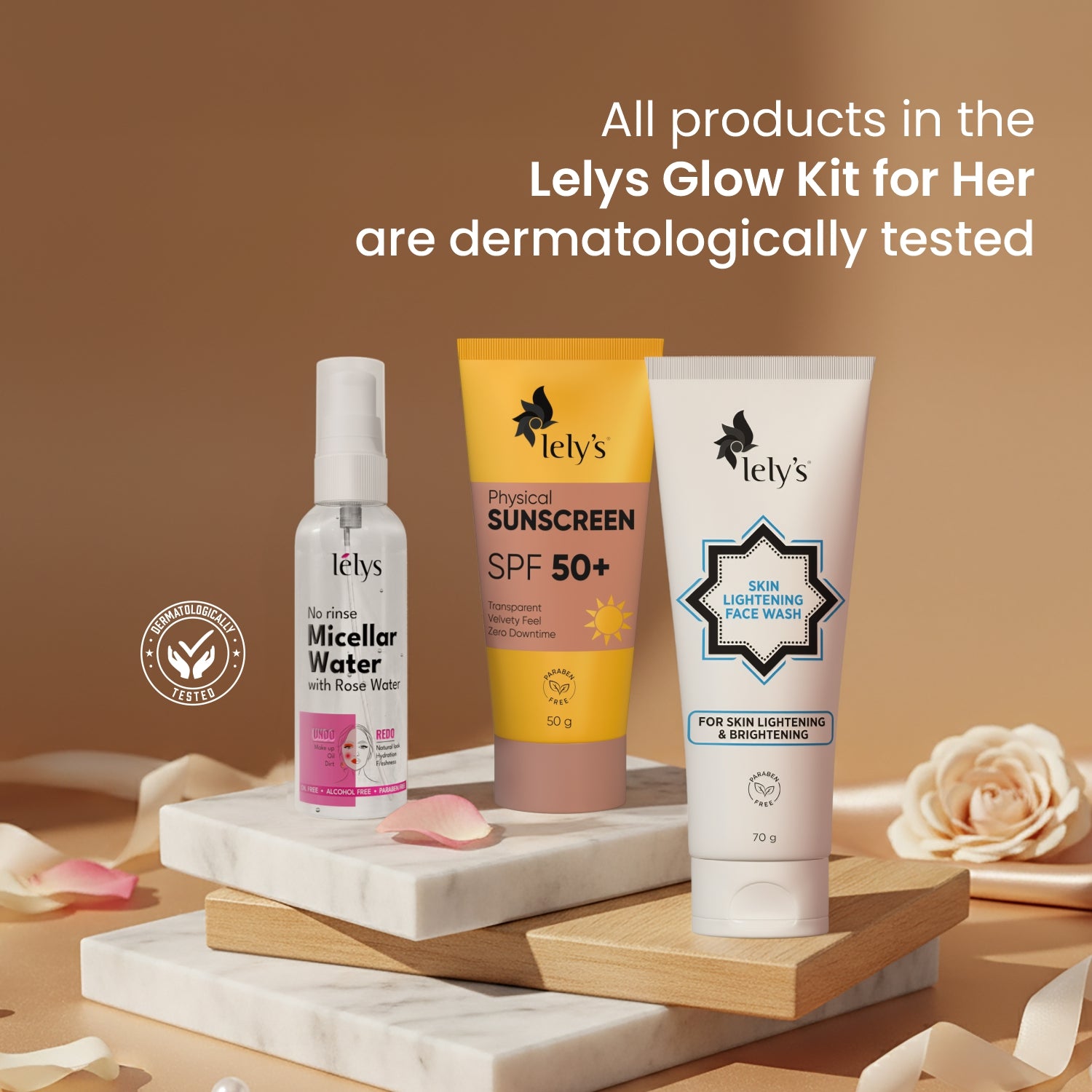 Lelys Glow Kit for Her is created to give you a ritual of care, a simple yet powerful kit that preps, restores, and protects your skin before, during, and after the celebrations. Each product in this kit is dermatologist-tested, thoughtfully formulated, and perfectly balanced for Indian skin and climate.
