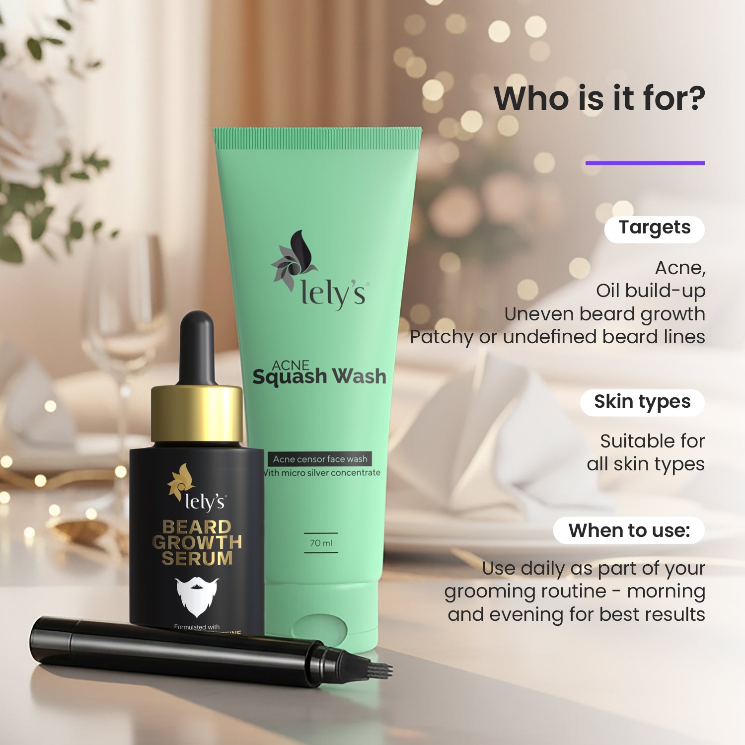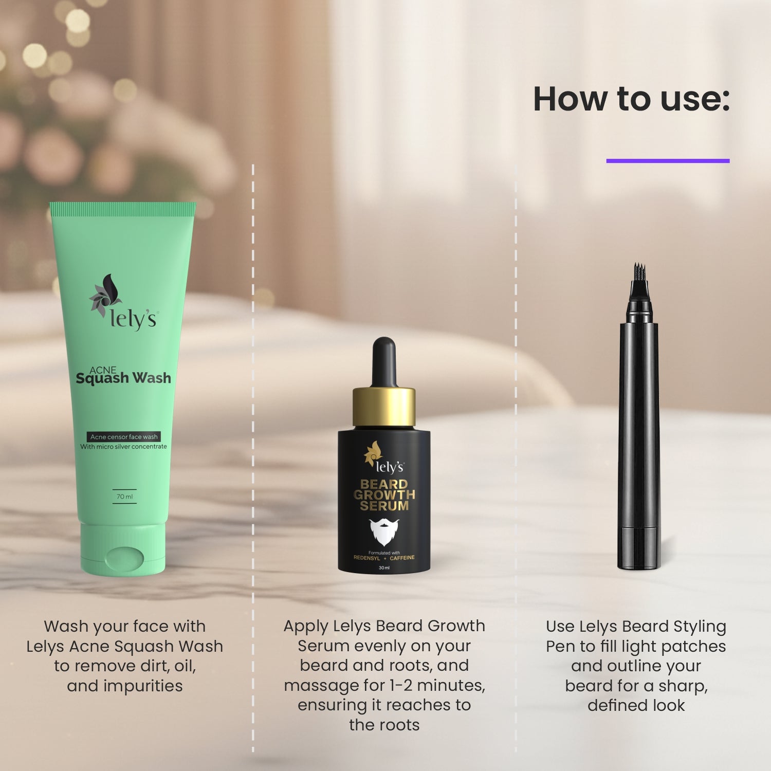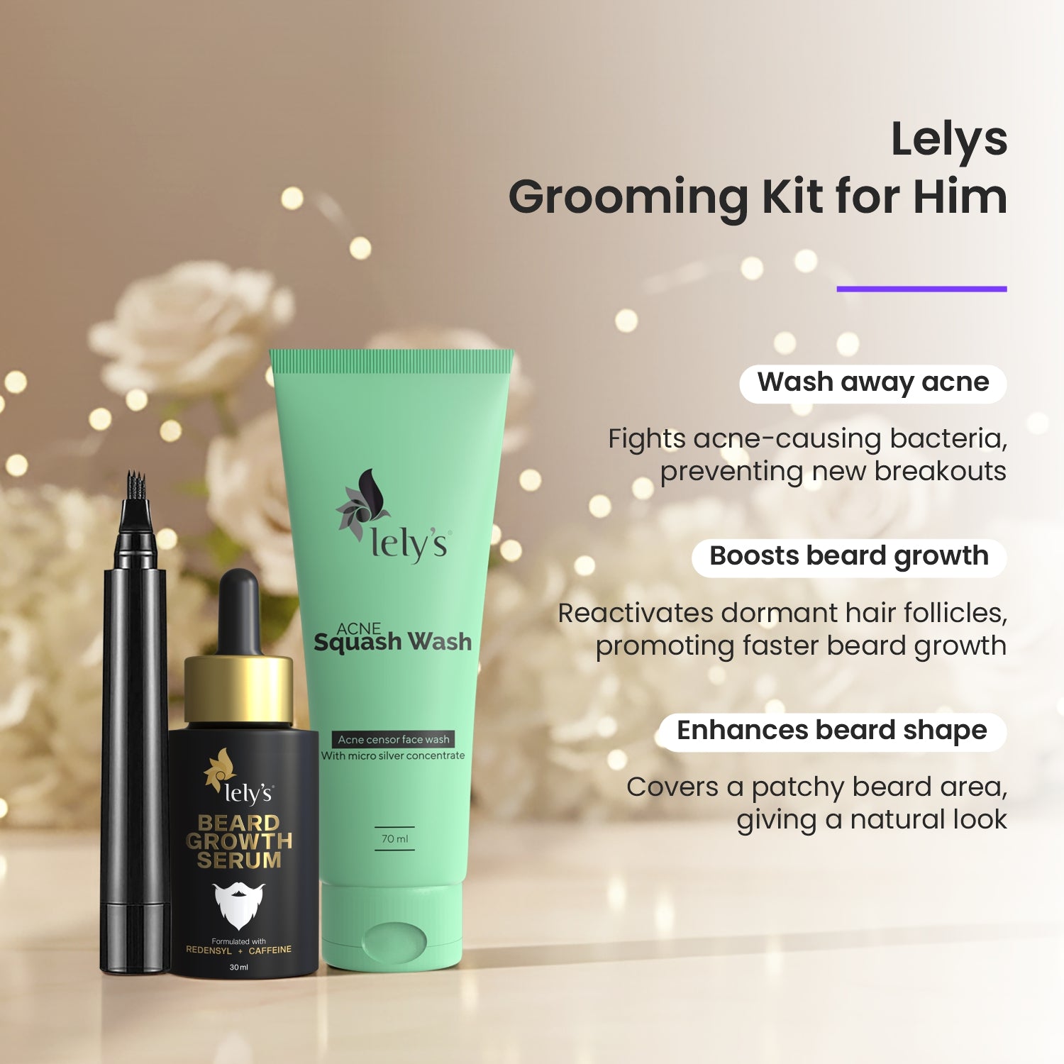 Lelys Grooming Kit for Him is thoughtfully curated to help every man look fresh, confident, and effortlessly well-groomed. This simple 3-step routine focuses on clear skin and a fuller, defined beard, the essentials of everyday confidence. Whether it’s dull skin, stubborn acne, or a patchy beard, this kit is designed to resolve the most common grooming challenges men face.