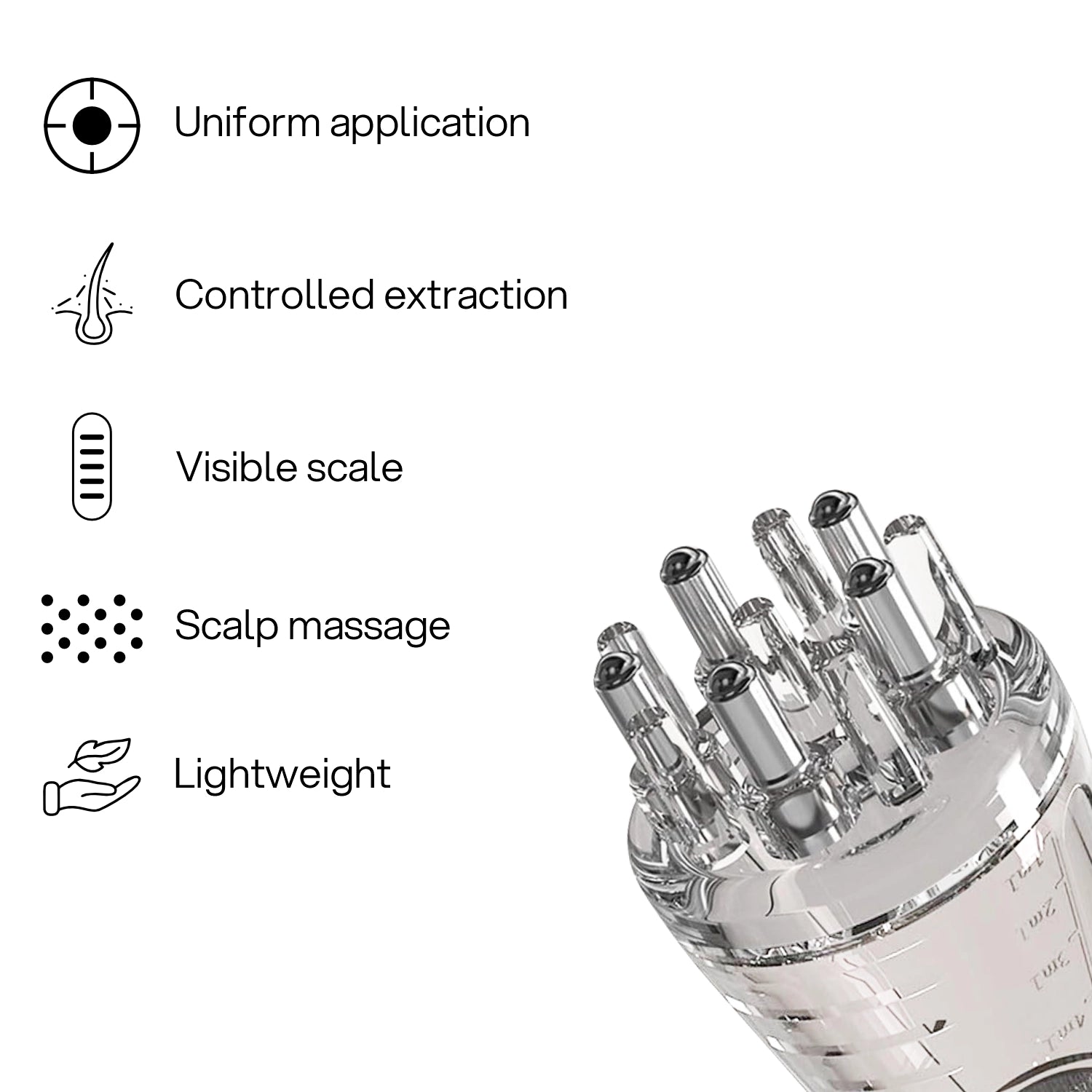 It is suitable for all hair types, including straight, curly, thick, and fine. The applicator's five ball heads ensure smooth discharge of the solution, and six connecting columns massage the scalp and help absorb the solution effectively.